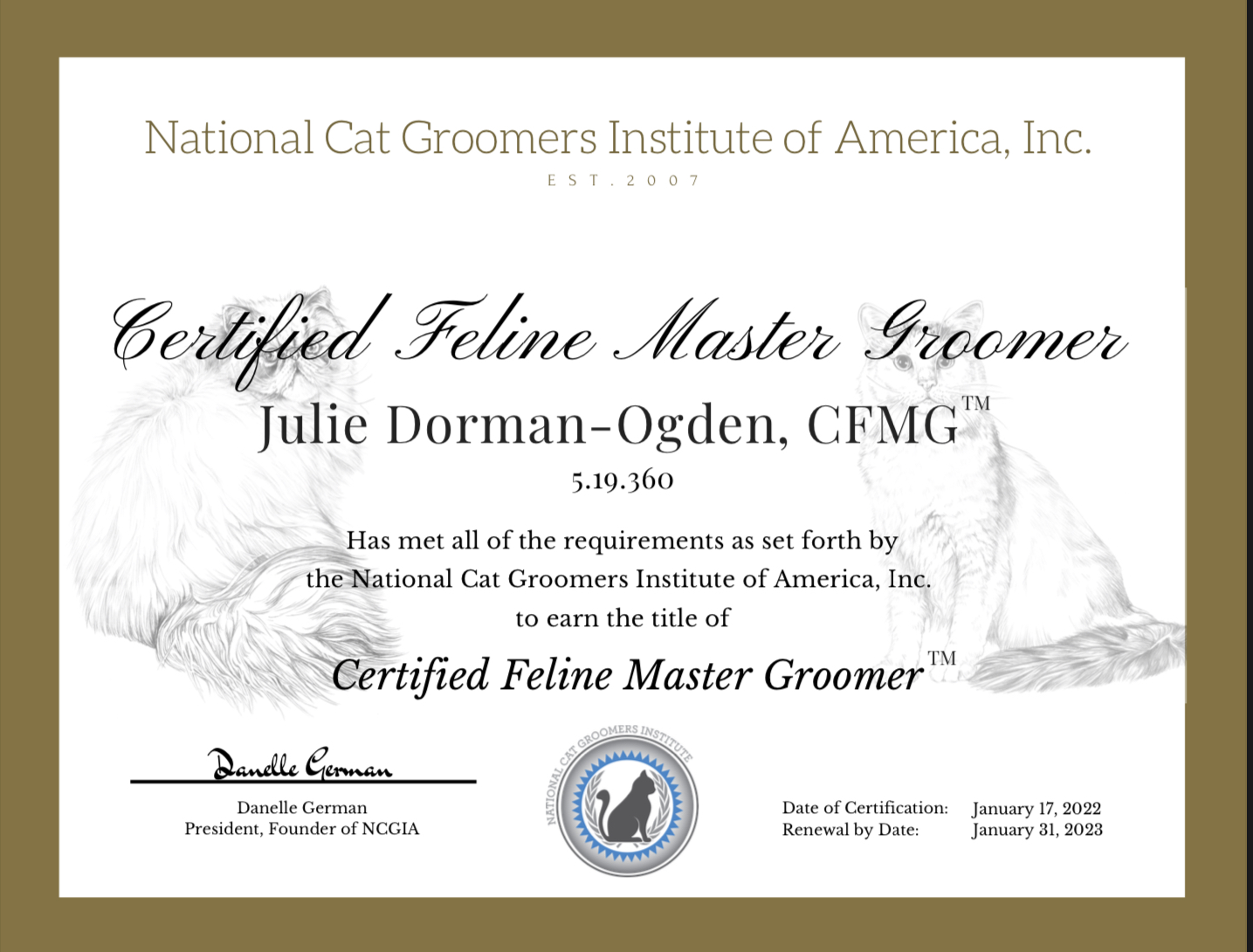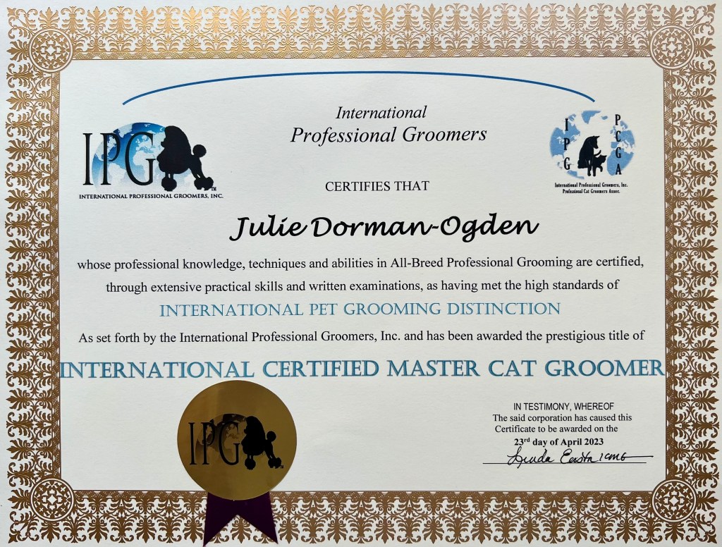 As a Certified Feline Master Groomer operating from a purpose built ‘Cat Exclusive’ salon, you can be assured that your favourite feline is in good hands with me. My aim is to ensure your kitty is safe and secure, with the utmost care and consideration given to their individual needs.